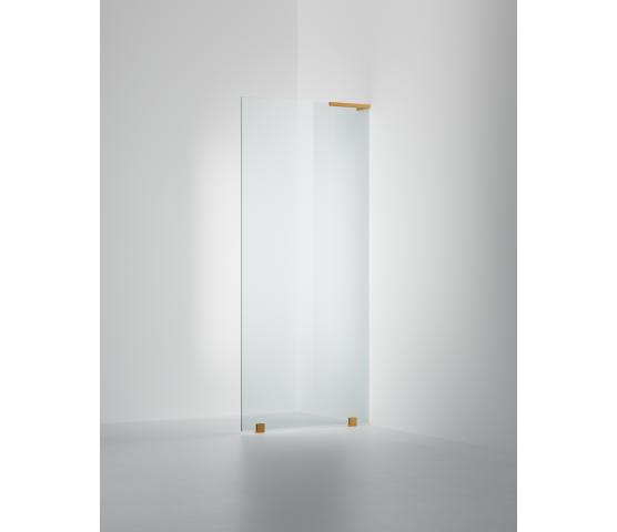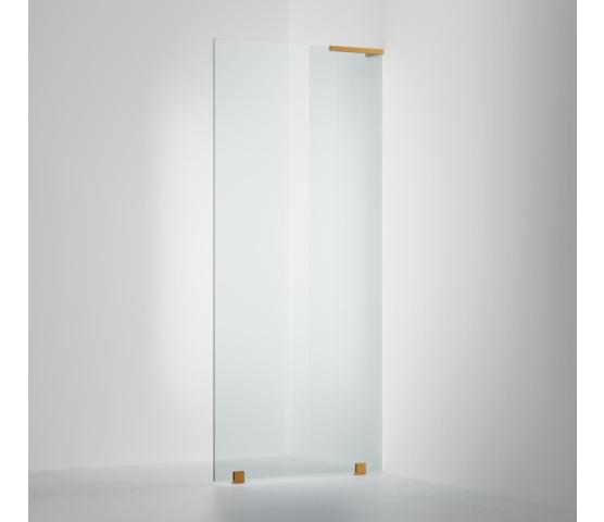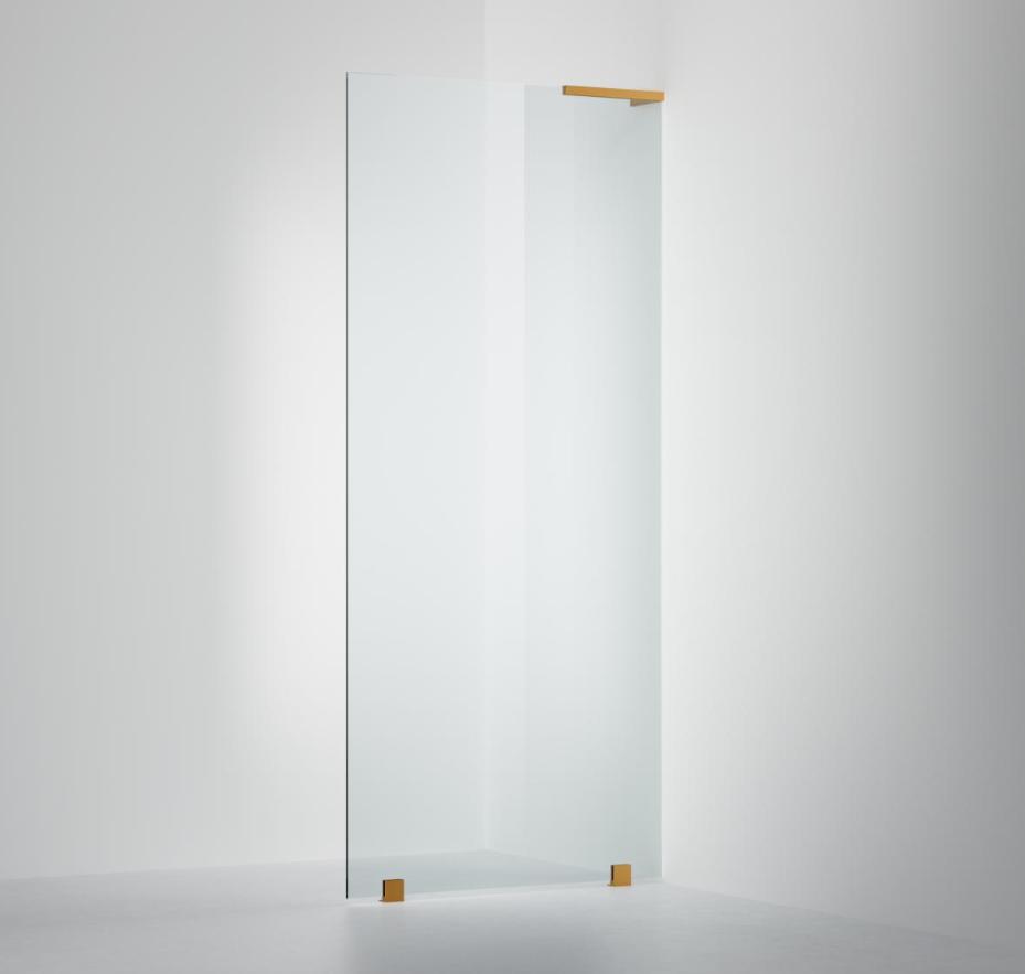 Lekker fastvegg som leveres i målene 800 eller 900 mm. Kan også bestilles som måltilpasses innen størrelsen 400-1200 mm. Ta kontakt vis det er ønskelig. Her er modellen i klart glass og Brushed Brass profil.