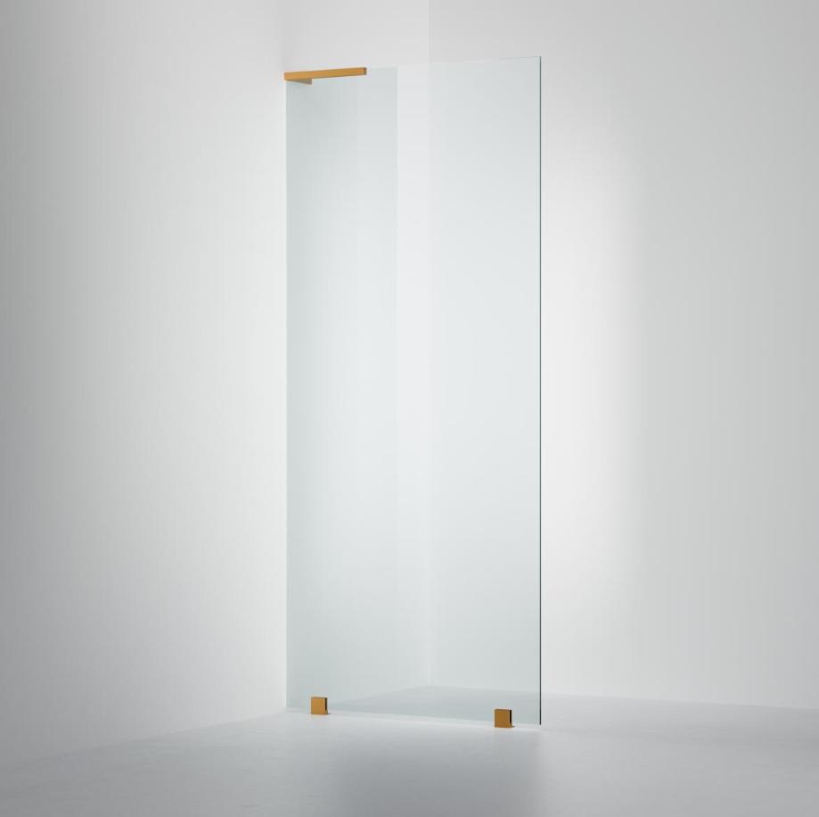 Lekker fastvegg som leveres i målene 800 eller 900 mm. Kan også bestilles som måltilpasses innen størrelsen 400-1200 mm. Ta kontakt vis det er ønskelig. Her er modellen i klart glass og Brushed Brass profil.