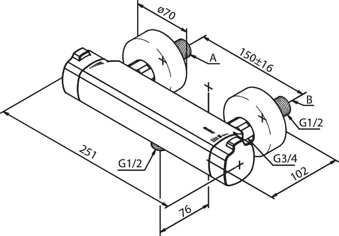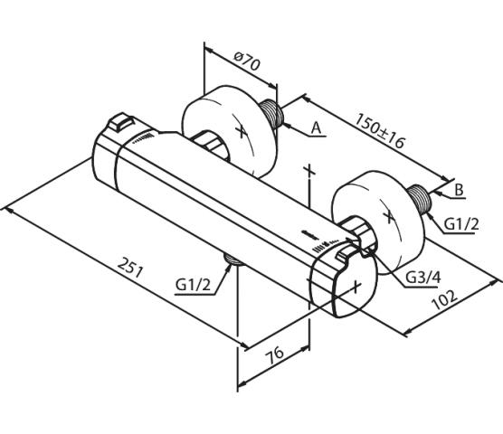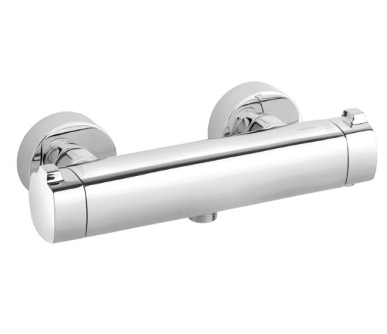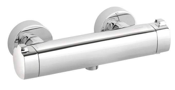 Termostatstyrt kran for dusj. Med grepsvennlige hendler for innstilling av vannstyrke og temperatur. Ecosave-knapp for ekstra vannsparing.