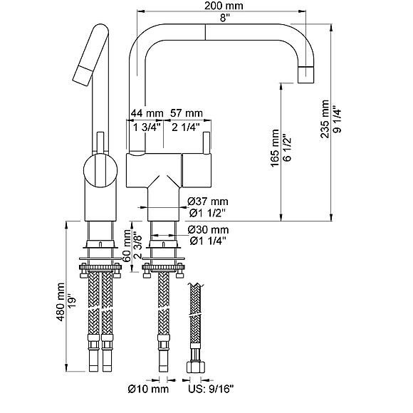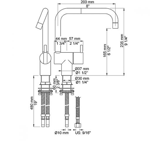 - Dobbelt svingbar tut med 235 mm høyde og 200 mm utspring